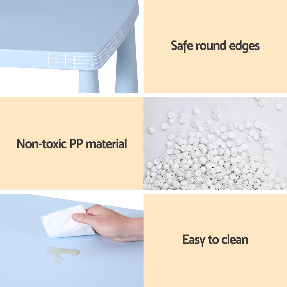 Make playtime or study time more enjoyable with the Keezi Kids Table and Chairs Set. Designed in fun blue and pink colours, this set includes one table and two matching chairs, perfect for children aged three years and above. Made from non-toxic PP material, the table and chairs are both durable and practical, ensuring long-lasting use. The smooth edges ensure safety, while the sturdy construction provides stability for various activities. Easy to assemble and simple to maintain, this set is the ideal addition to any child's room or play area.
