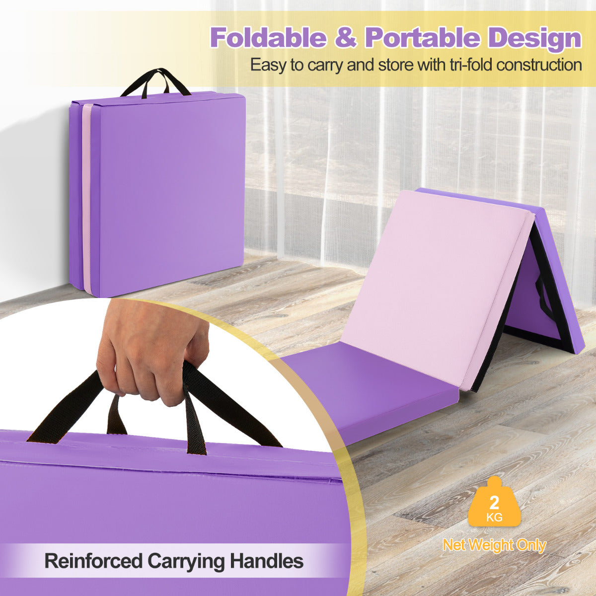 180x60cm 3-Fold Exercise Mat | Pink Purple | 2 Handles EPE Filler