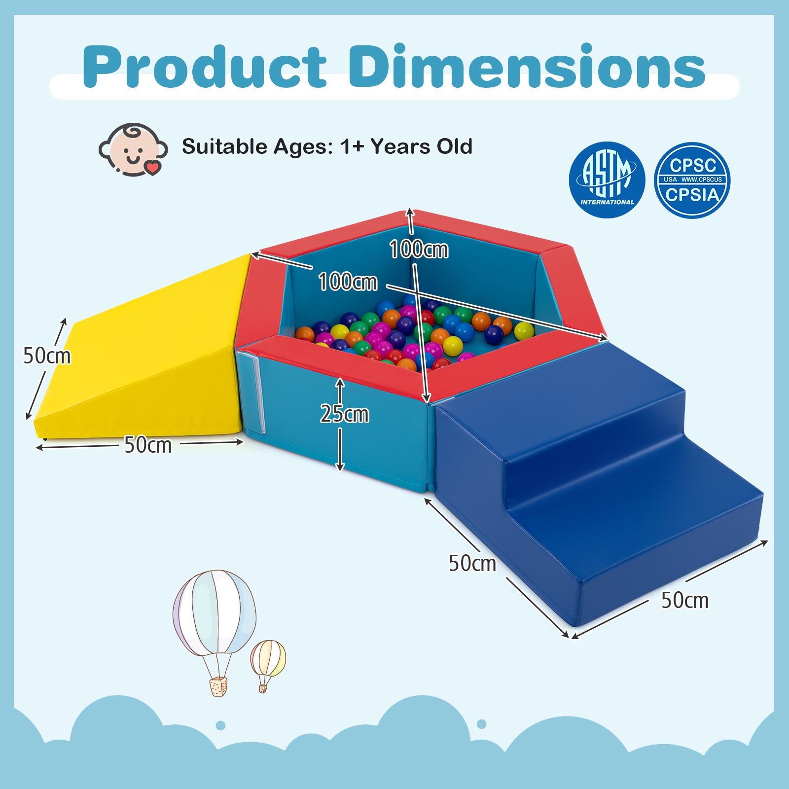 - Ball Pit Dimensions: 100 x 100 x 25 cm (L x W x H)