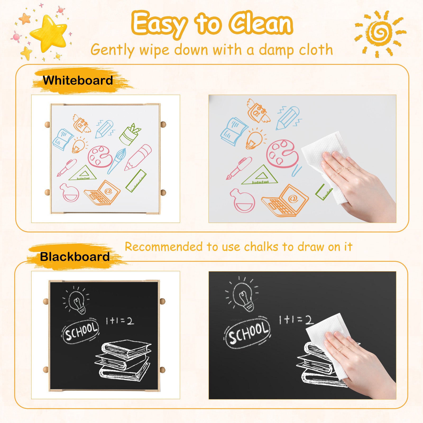 - 4 in 1 design with reversible tabletop for whiteboard and chalkboard activities