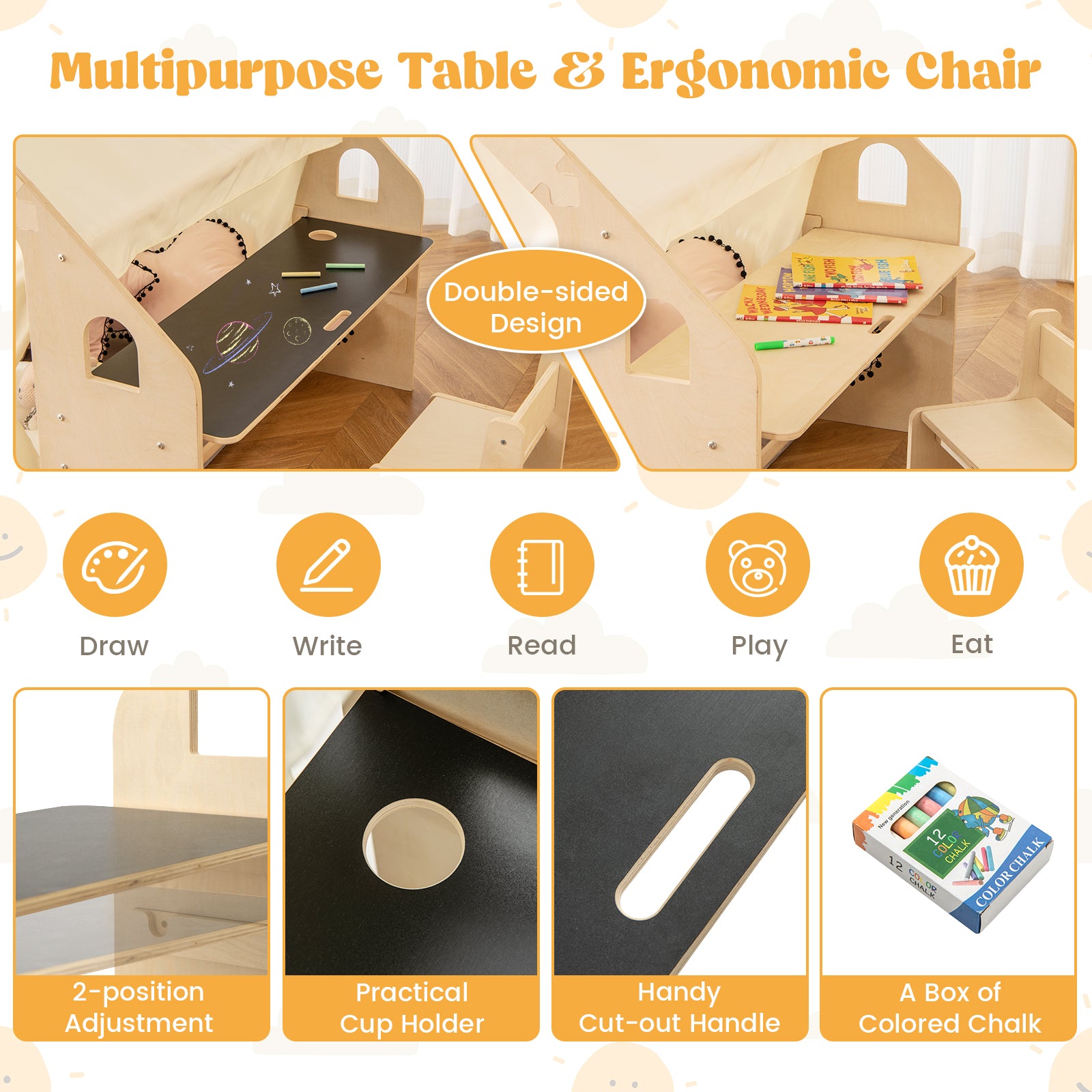 6 In 1 Wooden Kids Playhouse | Tent Table Chair Storage Natural