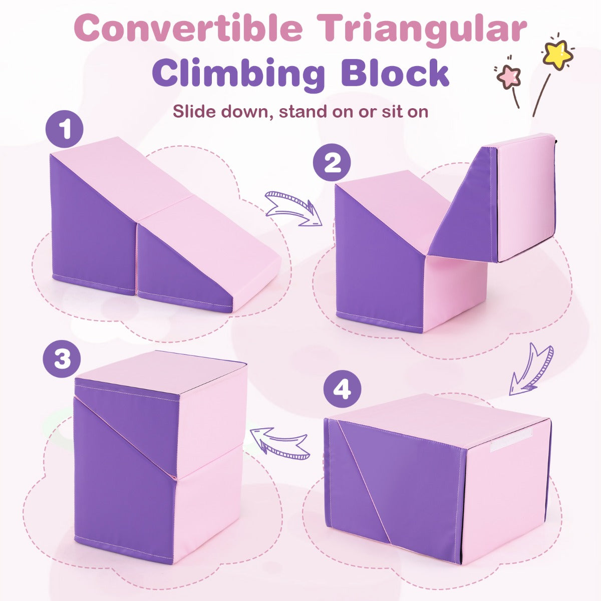 - Convertible triangular block for sliding, standing, or sitting