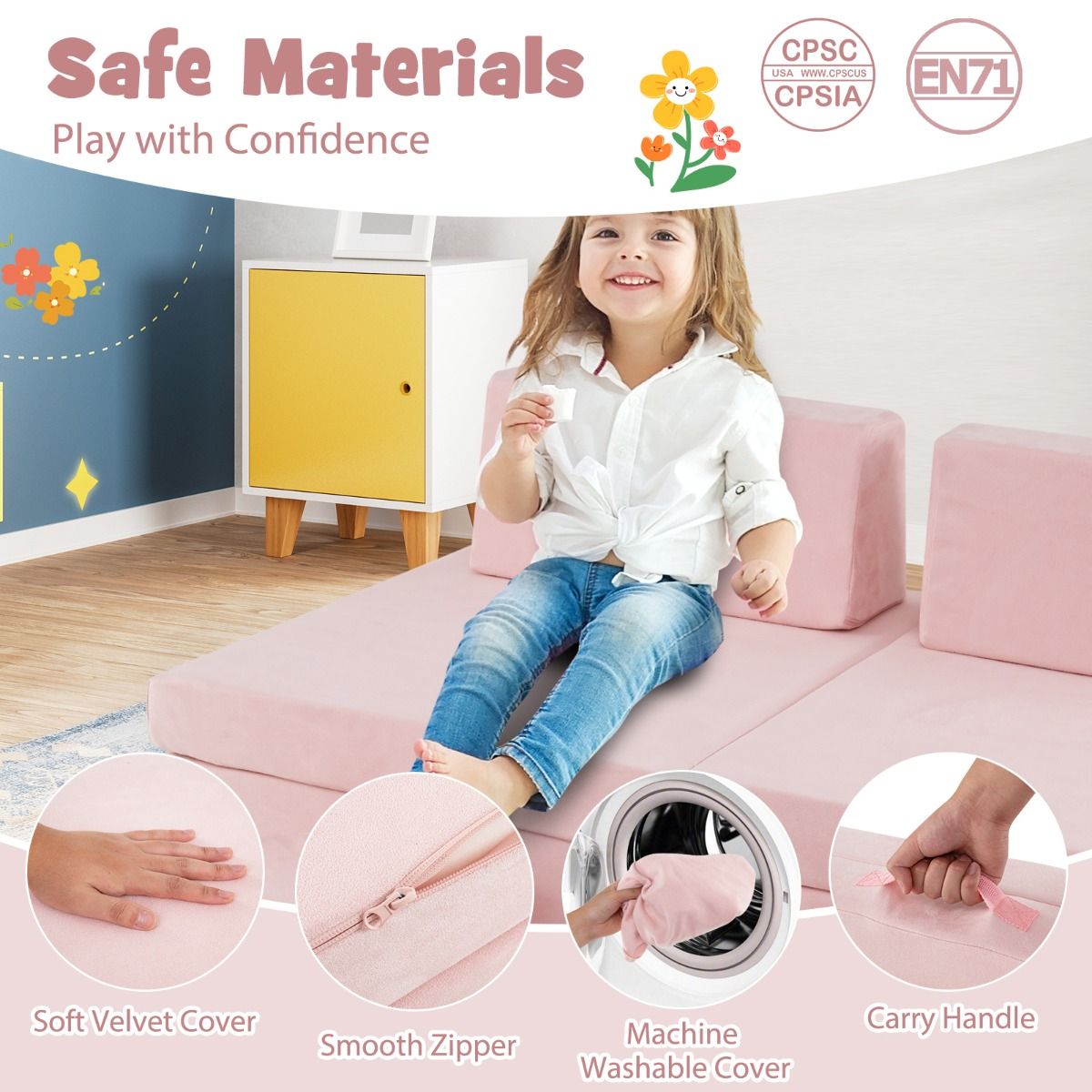 Pink Velvet Kids Play Couch Set | 6 Piece Foam Blocks