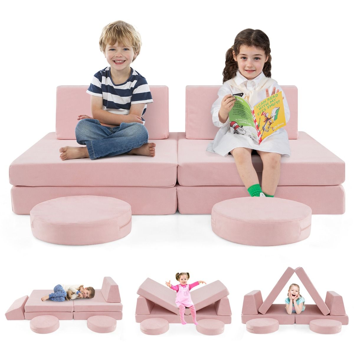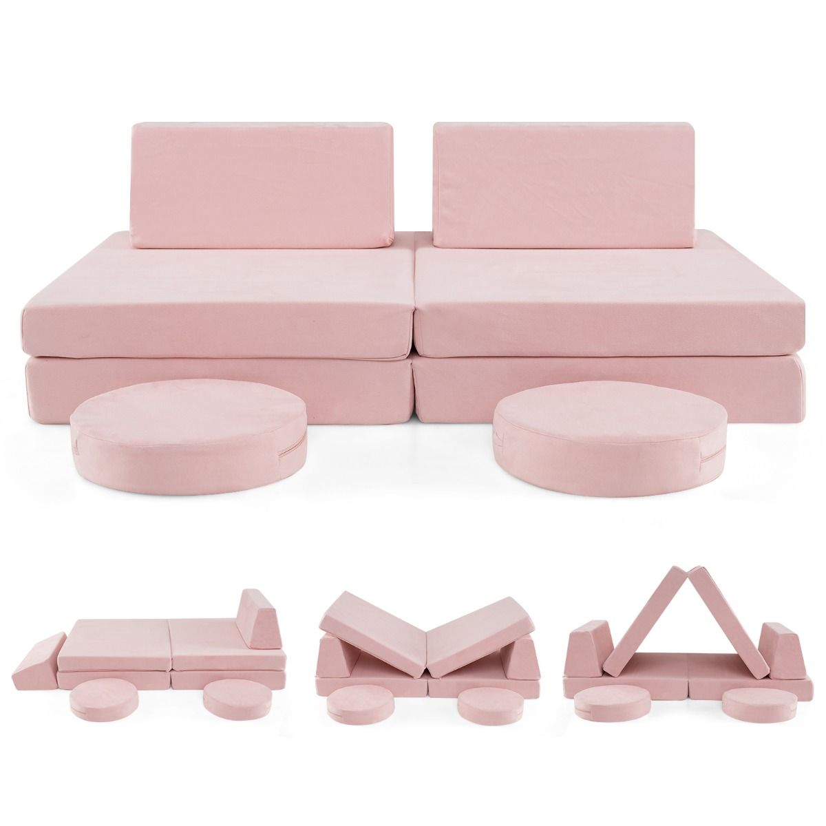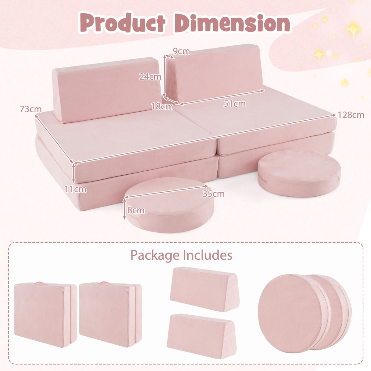 Unleash your child's creativity with our versatile and exciting 6 Piece Modular Kids Play Couch Set. Perfect for playrooms and nurseries, this pink velvet foam block set is designed to provide endless hours of fun for children aged 3 and up.