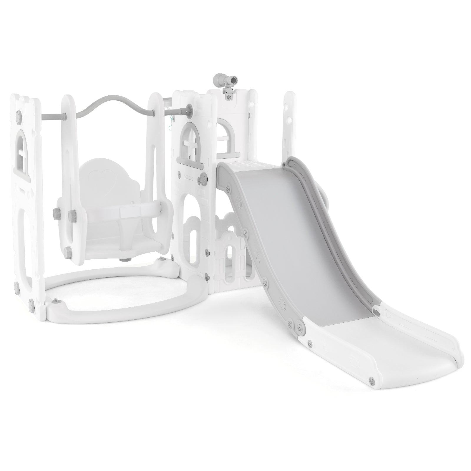 - Seven different play activities including swing, slide, basketball hoop, telescope, climber, hiding spot, and storage space