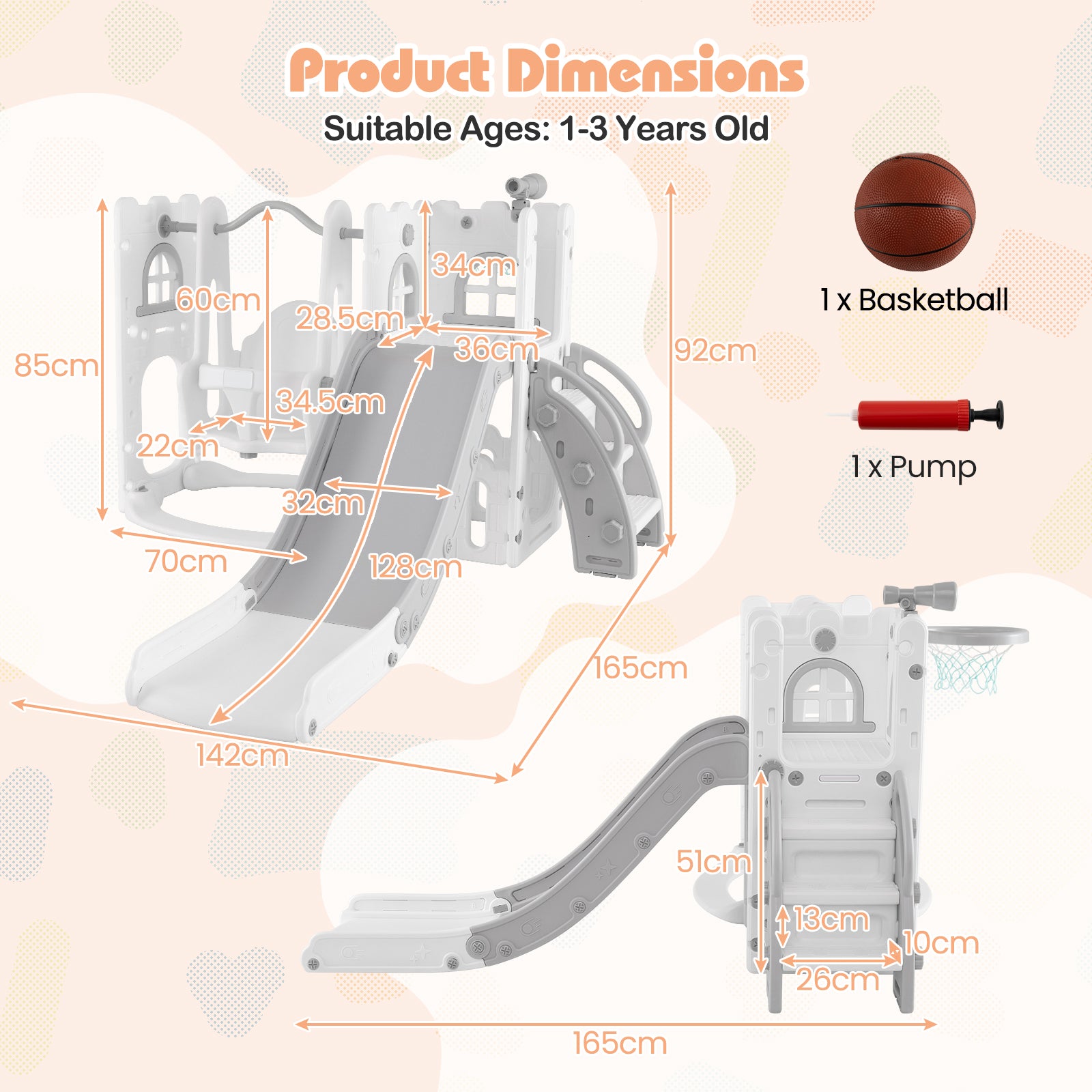 - Package Includes: Slide set, basketball, pump, and instruction manual