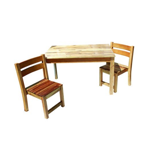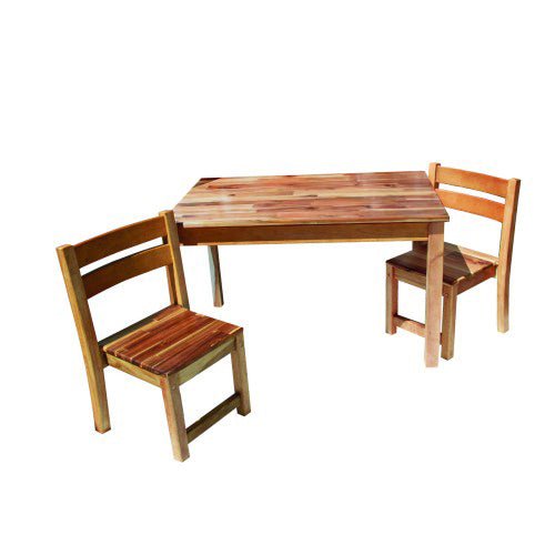 The set is made out of plantation acacia hardwood that is oiled and stained. All materials used are child-safe and non-toxic.