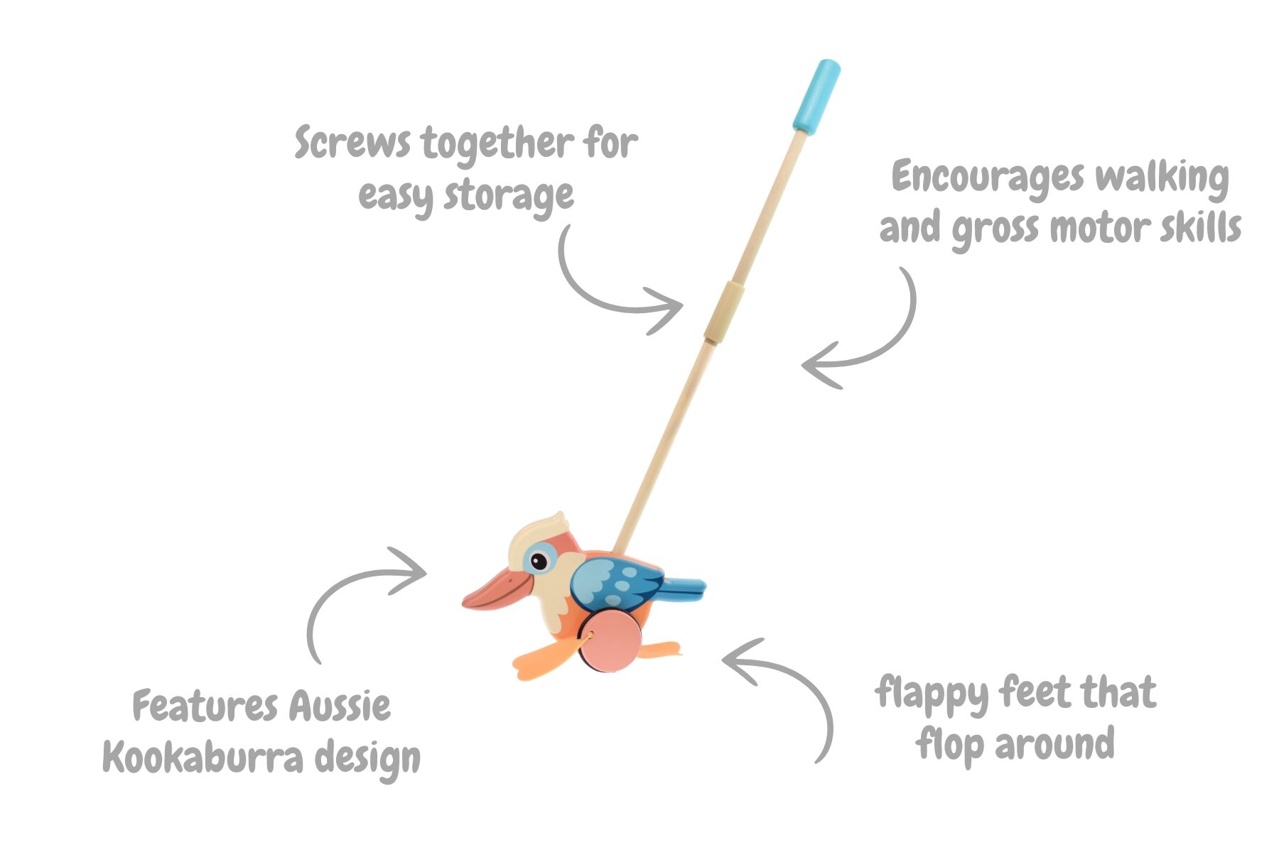 Finished with the highest care and coated in child-safe, non-toxic paint, the Push Along Kookaburra is more than just a toy—it’s a joyful companion on every adventure, bringing smiles and confidence as your child learns to explore their world one step at a time!