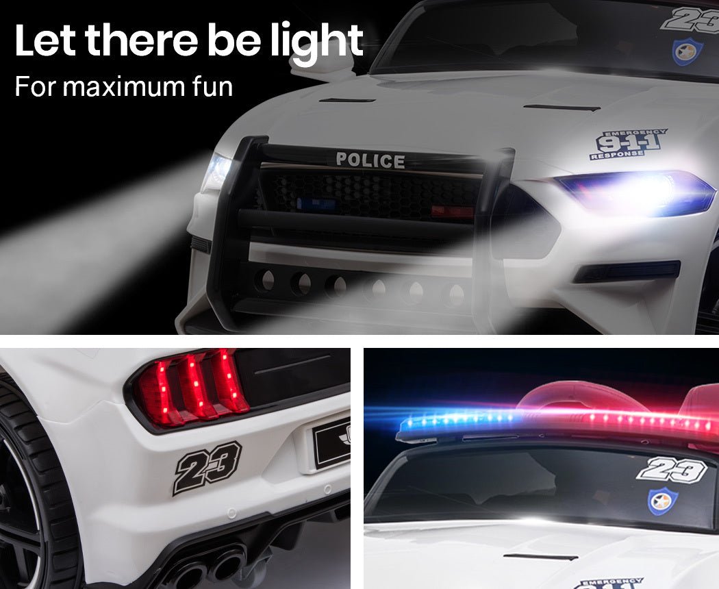 The Mustang Style Police Car features soft start which provides sensible acceleration. A 12V battery and twin motors offer unmatched range. The large wheels sport a rubber grip to stick to slippery surfaces and features a suspension to absorb harsh terrain.