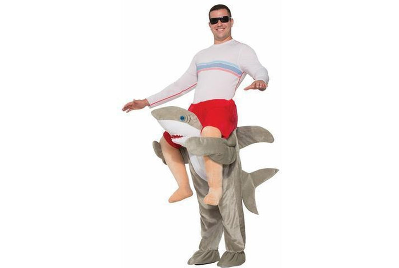 Transform into a hilarious human-shark hybrid with our Shark Piggy Back Costume for adults. This eye-catching, all-in-one jumpsuit creates the illusion that you're being carried by a friendly shark. The plush, waist-high design features realistic shark details, including a menacing mouth, eyes, and two attached, fiber-filled fins. The costume's clever ride-on style includes fake legs, giving the impression that you're piggy-backing on a shark's shoulders. Stuffed with soft poly-fill for a comfy fit, the jumpsuit has an elastic waistline for easy wear. Perfect for Halloween parties, beach-themed events, or any occasion that calls for a splash of humor. Please note: rash vest, board shorts, and sunglasses are not included. Get ready to make waves and become the center of attention with this unique and amusing costume.