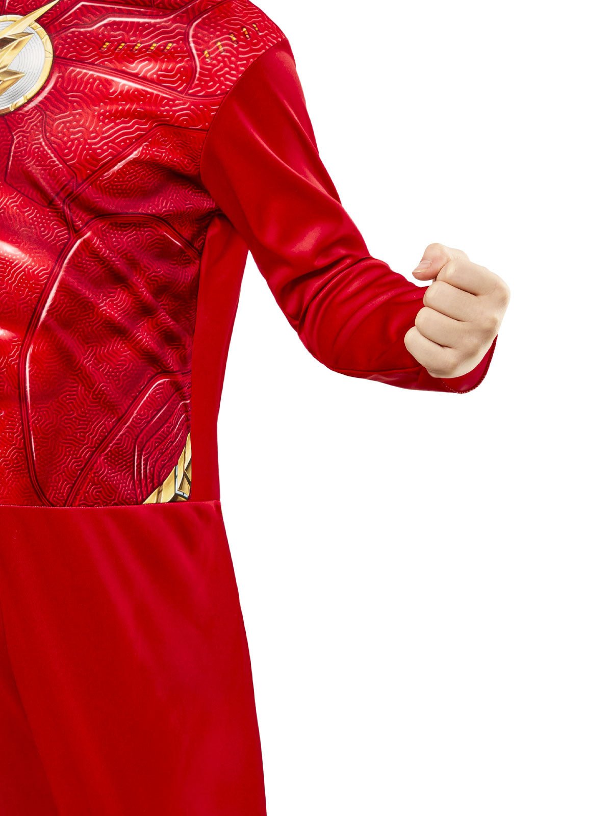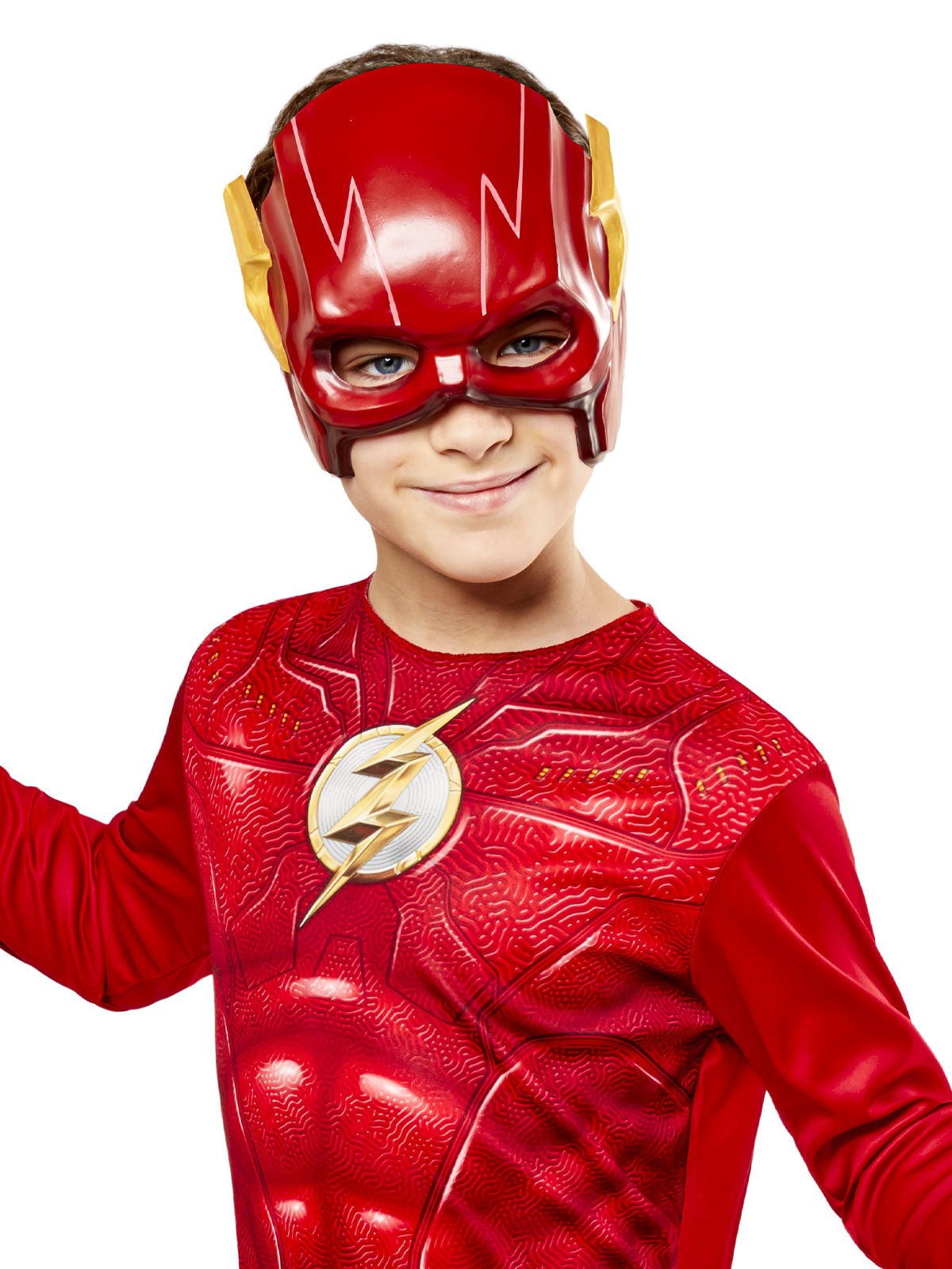 Transform your little speedster into Central City's fastest hero with this awesome Flash costume for kids. The vibrant red jumpsuit features digitally printed muscles and shiny fabric on the front, giving your child an authentic superhero look. The iconic Flash emblem boldly adorns the chest, just like Barry Allen's suit. The costume comes complete with a molded half mask, expertly painted with The Flash's features and secured with an elastic strap and hook-and-loop fastening for comfort. Perfect for Halloween, superhero-themed parties, or everyday imaginative play. As an officially licensed DC Comics product, this high-quality costume ensures your child will feel like a true member of the Justice League. Please note that shoes are not included, allowing your young hero to wear their favorite running shoes for maximum speed. Suit up and get ready to save the day at supersonic speeds.