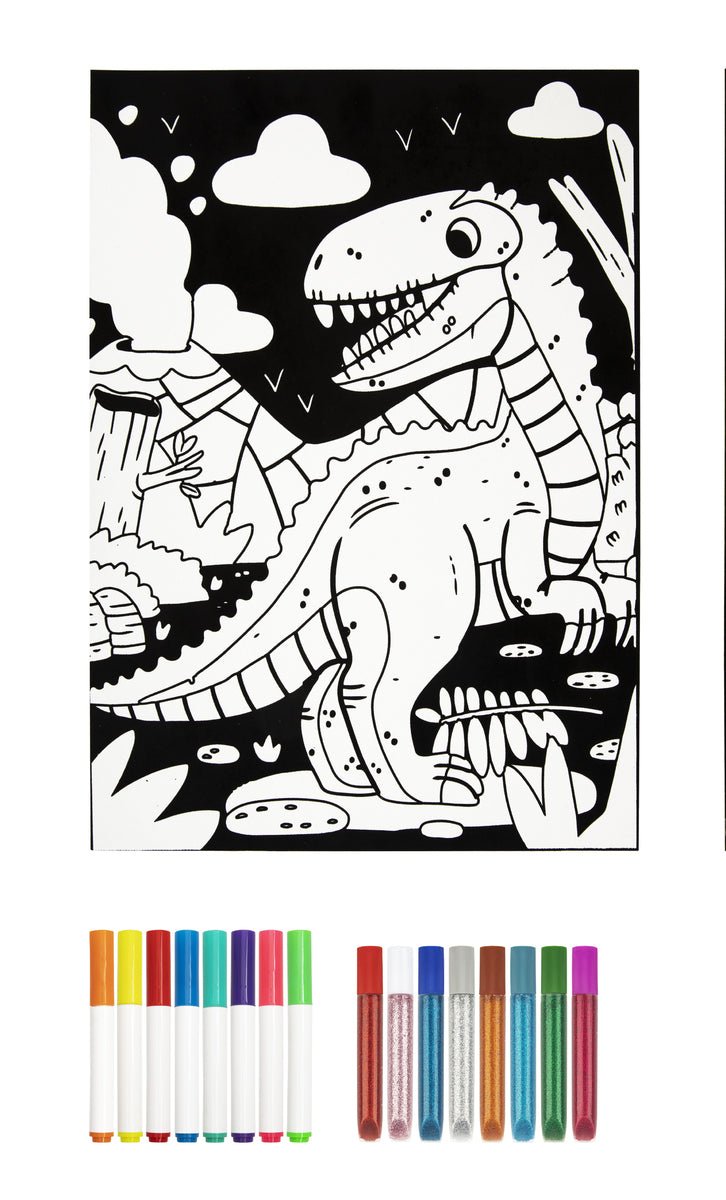 - Includes: Large flocked board with dinosaur image, 8 coloured markers, 8 glitter glue pens
