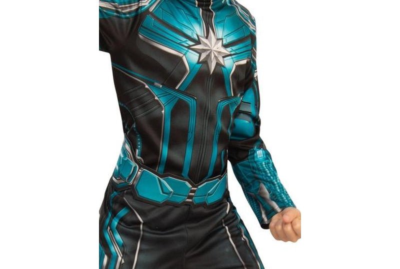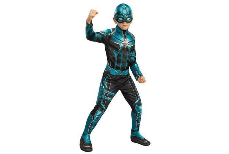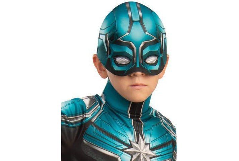 Transform your child into the formidable Yon-Rogg with this officially licensed Marvel Captain Marvel costume. The digitally printed jumpsuit features intricate designs on both front and back, showcasing the iconic star emblem on the chest. Detailed printing extends throughout the legs, arms, and torso, creating a realistic Kree warrior look. The costume includes printed gauntlets and shin guards for added authenticity. A foam-backed belt with a digitally printed design completes the ensemble. The half mask, complete with eye holes and see-through mesh, allows for comfortable wear while maintaining the character's appearance. This high-quality costume is perfect for Halloween, cosplay events, or imaginative play. Please note that shoes are not included. Bring the excitement of the Marvel Cinematic Universe home with this impressive Yon-Rogg costume.